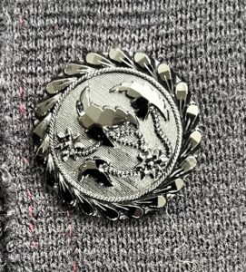 She instructed me not to ‘waste’ them. I kept them safe and unused for over thirty years, until one day I realised there was no point stashing them unseen in a sewing box. I immediately sewed them onto a much-loved second-hand jacket which brings me pleasure each time I wear it.